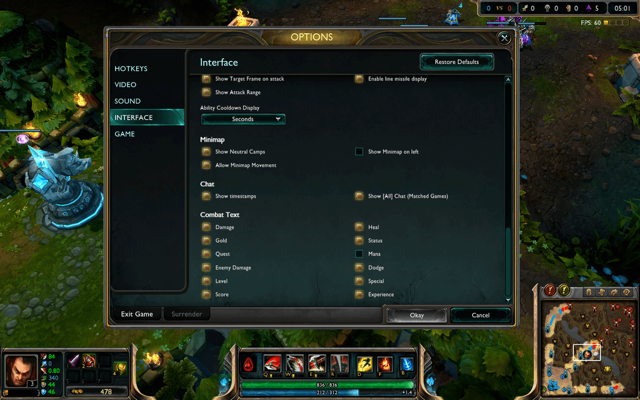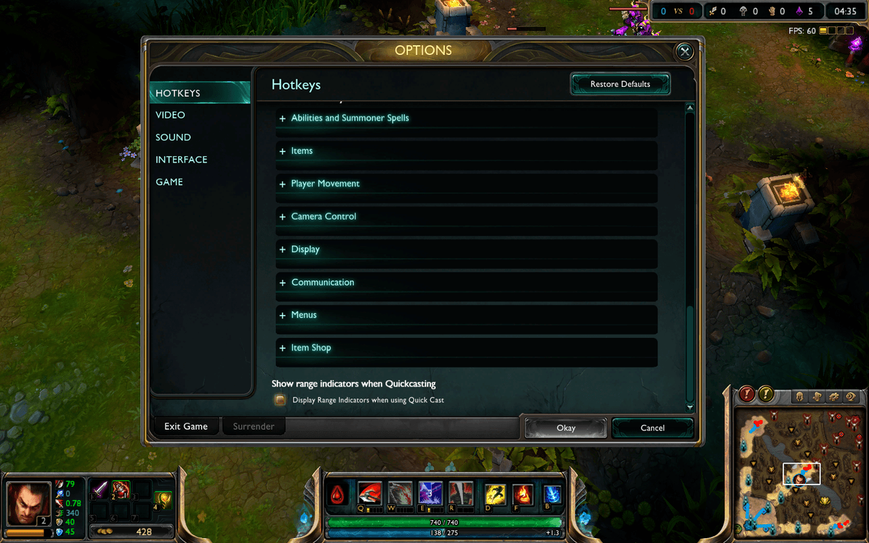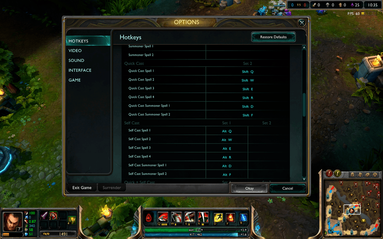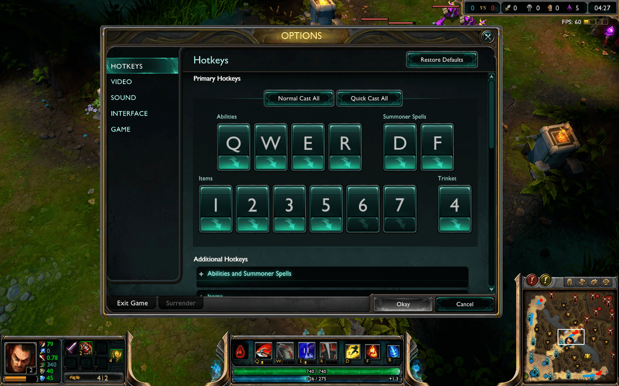 If you’re like me, you probably struggle with any more than a few active items (*cough* support items *cough*) and might end up using your Zhonya’s hourglass by mistake instead of warding. By finding comfortable buttons for active items, they will be much easier to use. If you happen to be lucky enough to have a mouse with additional buttons on it, try binding item slots to them in the settings menu (and consider smartcasting some of them as well!). This includes moving your items around as you buy them so that you consistently have your active items on the same keys game to game. Especially for champions who can ward jump (such as Lee sin, Katarina and Jax), binding a key to a place a ward is very useful.