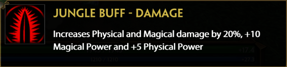 The Damage buff provides a rather significant amount of percent increase to both Physical and Magical power, as well as a base of 10 Magic Power and 5 Physical. By having both percent and base damage gains, the buff remains relevant through all stages of the game. Magical Power on this buff is at a higher base due to the fact that Magical and Physical scale differently, and players need more Magic Power than Physical to get the same output.