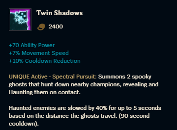 Lastly, Twin Shadows is the most aggressive item listed of the three but finds a place thanks to its large AP bonus and, more importantly, the Spectral Pursuit active ability. This gives the user fantastic control over the map, providing guaranteed vision over enemy targets that can be game-changing around major objectives and in preventing surprise ganks in lane. The slow on the active ability can also be used in a chase, to stop your opponents from getting away too quickly and allow yourself to secure a kill.
