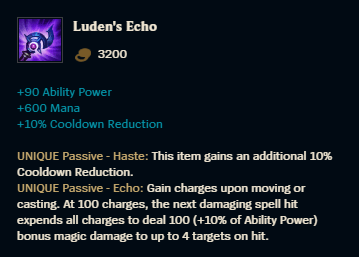 While it’s impossible to use the exact same items in every game with the same level of success, there are a number of key components of an APC’s build that are essential in the bot lane. Starting a build off with a Luden’s Echo is a great way to maintain early pressure and provide a great combination of stats for casters with considerable AP, mana, and CDR, as well as amplifying your early burst through Echo’s splash damage.