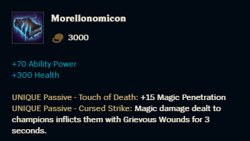 Finally, Morellonomicon works to counter the large amounts of healing that ADCs will be generating and receiving thanks to the Grievous Wounds granted by its unique passive, Cursed Strike. The extra magic penetration is also a huge bonus that can scale well as the game goes on, making this a great item for any APC in the bot lane.
