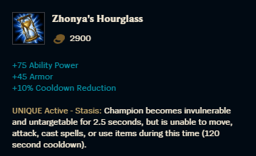 Zhonya’s Hourglass works fantastically against an AD-heavy enemy thanks primarily to the armor and active ability that it grants the owner. It’s one of the best defensive AP items in League of Legends currently and, considering you’ll likely be laning against a traditional enemy bot lane, you’re going to generate huge value from this particular item.