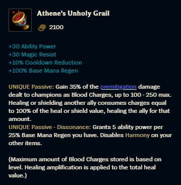 There are many items that work well for Mages in a Support role, both offensively and defensively. Firstly, Athene’s Unholy Grail is one of the most unique items in the game that benefit Mages that can shield and heal their allies through blood charges, converting damage dealt to team utility, while also providing mana regen and other minor stat bonuses. This item is a very useful item for the Supporting Mage that’s happy to stay out of a strictly carry-oriented role and give value to their team through shields and heals.