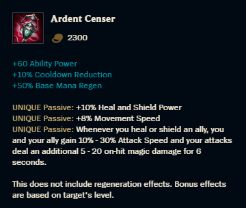Ardent Censer is the second item that is exceptionally useful for Support Mages, as it gives a relatively high amount of AP for its cost, as well as a powerful unique passive that buffs the recipient of your heals/shields with Frenzy (an attack speed bonus and magic damage on-hit). The mana regeneration provided by this item is also essential for a supporting Mage, making this well worth it in your build.