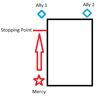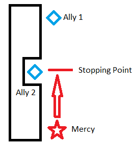 Here, the goal is the same: reach Ally 2 in the shortest time possible. Ally 2 is in cover, so there's no way to directly dash to him/her. The only apparent option is to walk up; however, given the additional information of Ally 1's position, the correct play becomes clear. You can dash towards Ally 1, then cancel GA when you're near Ally 2 to stop your momentum and get to healing your intended target. This is a relatively straightforward example, but the point is to get you thinking about ways you can use the teammates around you in order to creatively reach other targets (or just cover/locations in general) when you don't have a direct route or don't want to take the direct route. Using GA in this manner, even if your path to your teammate or location is indirect, will often be much faster than just walking. Get to thinking about that simple geometry! All kidding aside, these kinds of movements become clearer with experience and practice. You'll begin to pick up these non-linear (outside of their normal function, so to say) ability uses/lines of play and more quickly recognize when they're applicable as you play more and more Mercy.