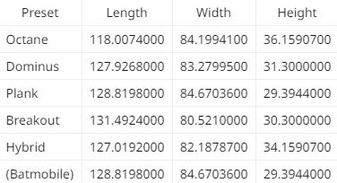 Hitboxes that are used in different car bodies are quite important to consider. Different hitbox shapes can determine how your gameplay is affected and a certain hitbox could be more useful to perform a specific trick. Below is a table giving you a bit more information behind the hitboxes that each car possesses, to give you an idea of the length, width and height of each. Remember all three of these factors are important in their own ways.