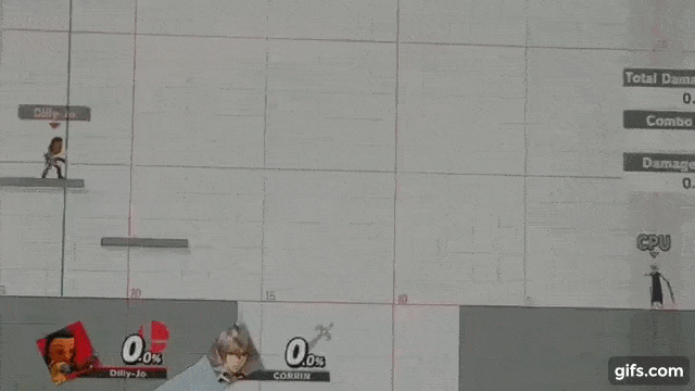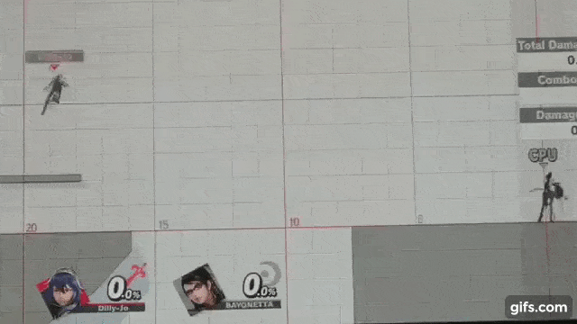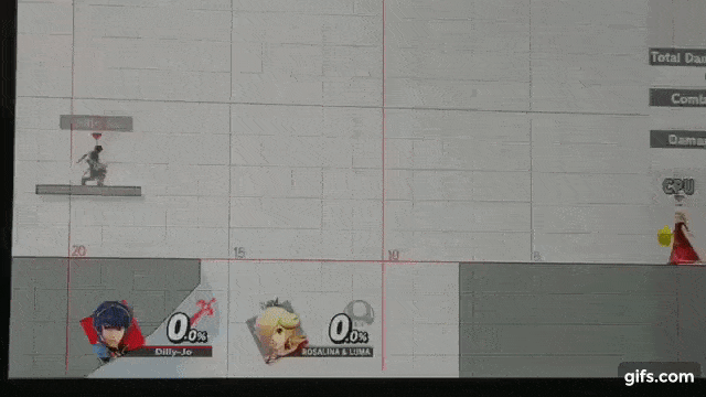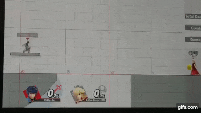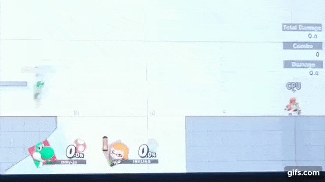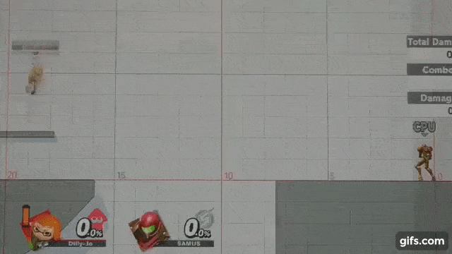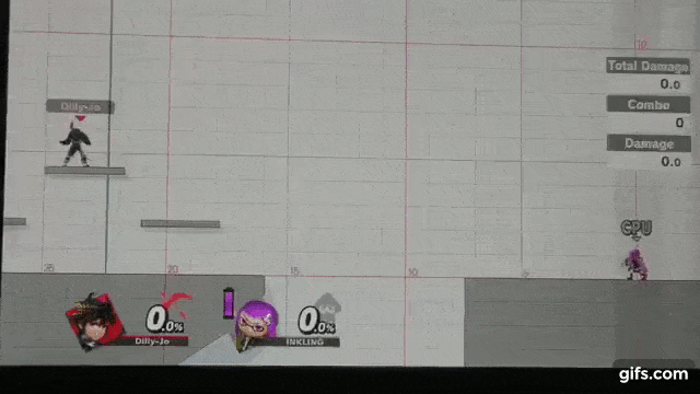 Inkling can travel a great deal of horizontal distance in the air with her Side-B, Splat Roller, assuming she has ink in her tank. If her ink tank is empty, the Splat Roller will not allow her to travel any distance. Inkling can jump out of the Splat Roller, and she will also perform a slight hop if she collides into a wall with the Splat Roller. This works well in conjunction with the fact that Inkling can wall jump.