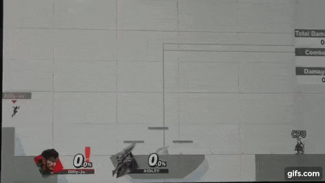 Ridley’s recovery sequence is vaguely reminiscent of Charizard’s in that he has two midair jumps and two recovery specials he can utilize. His Side-B, Space Pirate Rush, allows Ridley to rush forwards and cover a decent amount of horizontal space. For vertical recoveries, Ridley must use his Up-B, Wing Blitz. Despite appearing similar to such moves as Fire Fox, Ridley’s Up-B only has four unique angles (for each direction Ridley is facing), giving Ridley much less wiggle room when deciding how to best recover. Notably, Ridley's forward facing Up-B will travel at a slight downwards angle, whereas his backwards facing Up-B will travel slightly upwards.