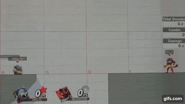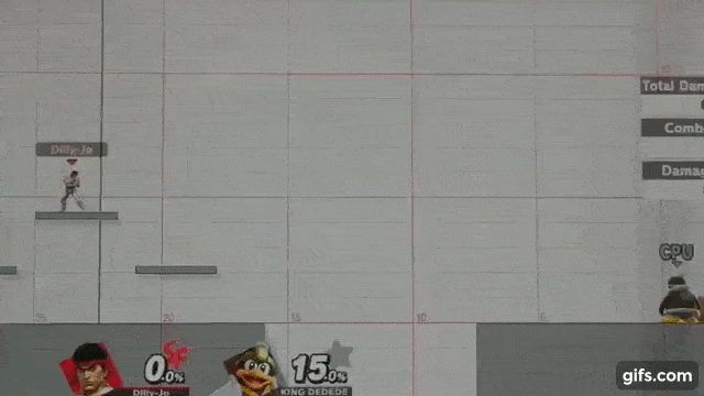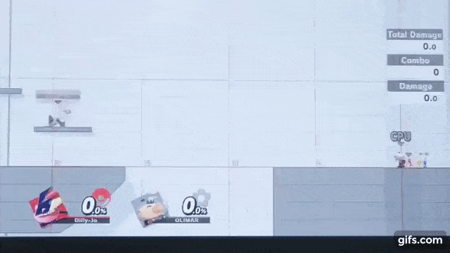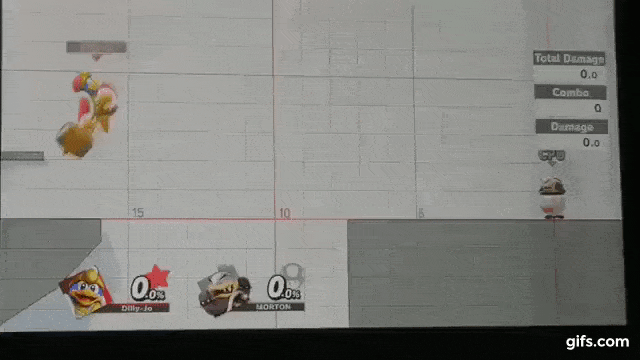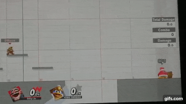 Dedede possess four midair jumps, as well as a very high-reaching Up-B, Super Dedede Jump. Dedede must be careful not to use the move’s falling hitbox while offstage, as it cannot grab the ledge. For this reason, Dedede may find it helpful to cancel the falling animation by pressing either up or B. Upon doing so, Dedede will enter his helpless state, but he will have more control over his aerial drift than if he utilized the falling hitbox.