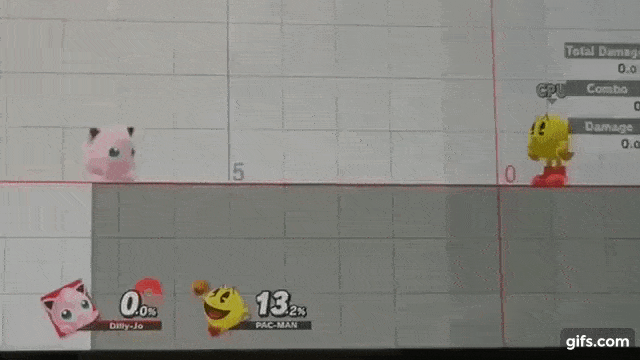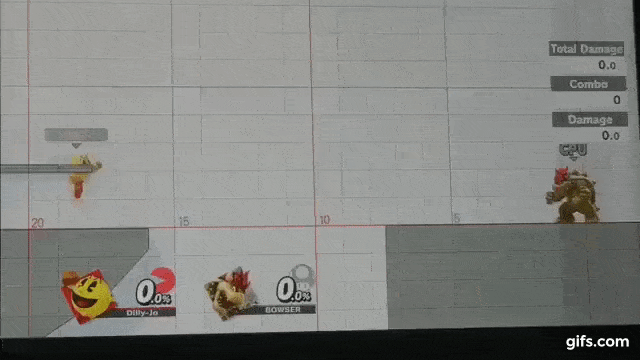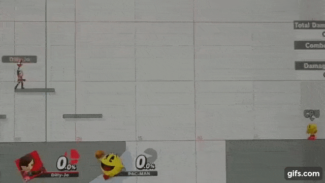 His Up-B, Pac-Jump, rockets him into the air off of a trampoline. If he does not gain enough vertical distance the first time, he can fall back onto the trampoline two more times, gaining additional height with each subsequent bounce. However, PAC-MAN must be careful not to drift past the trampoline and fall to his demise, nor can he afford to let his opponent jump on the trampoline to make it disappear. PAC-MAN is also able to wall jump.