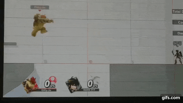 Bowser Jr. can travel a significant horizontal distance using his Side-B, Clown Kart Dash. He can perform a jump to cancel this attack, even if he has already used his double jump. In order to cover vertical distance, he must use his Up-B, Abandon Ship! It is a decent recovery move, but Bowser Jr. is vulnerable to being gimped afterwards, so it is best to Abandon Ship! straight to the ledge. While he is outside of the Junior Clown Car, Bowser Jr. can perform an attack with a hammer, and he can neutral air dodge (he cannot, however, directional air dodge).