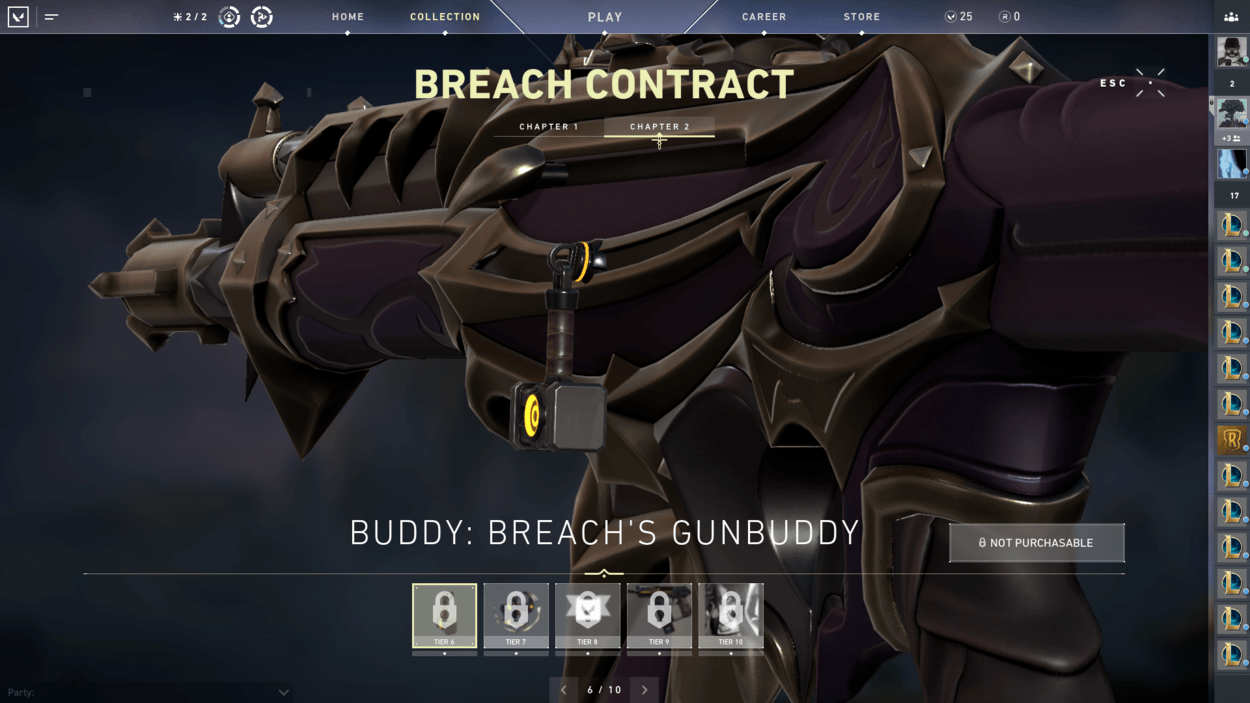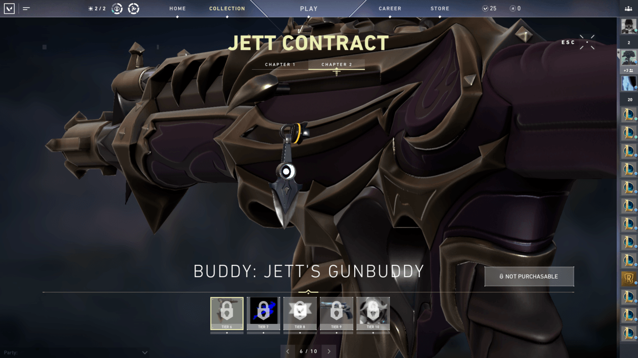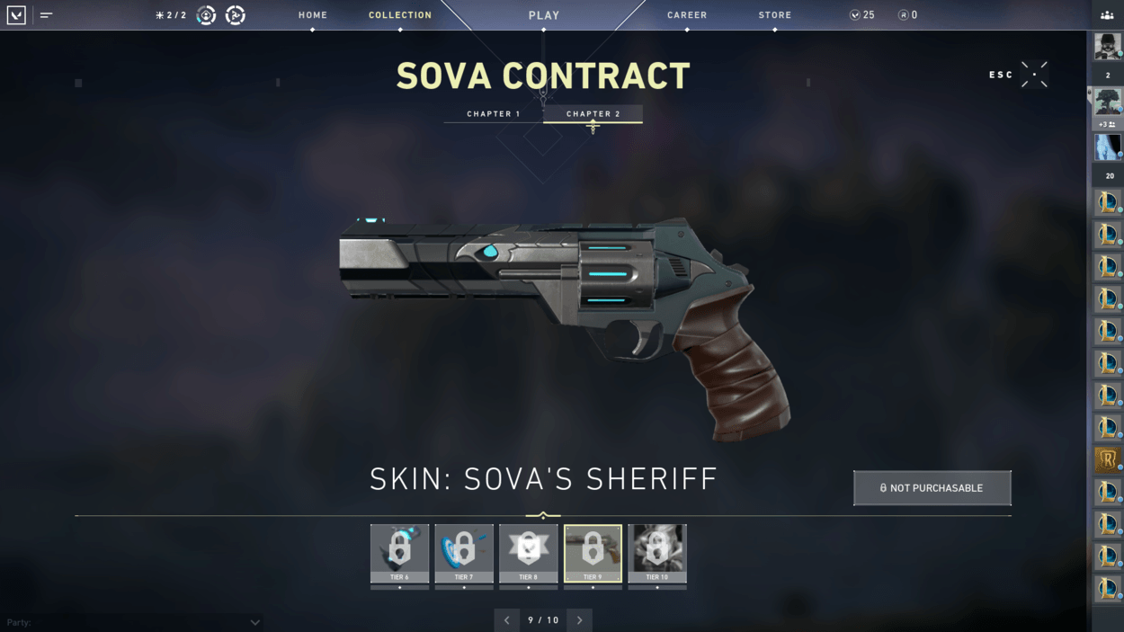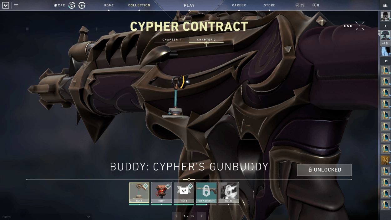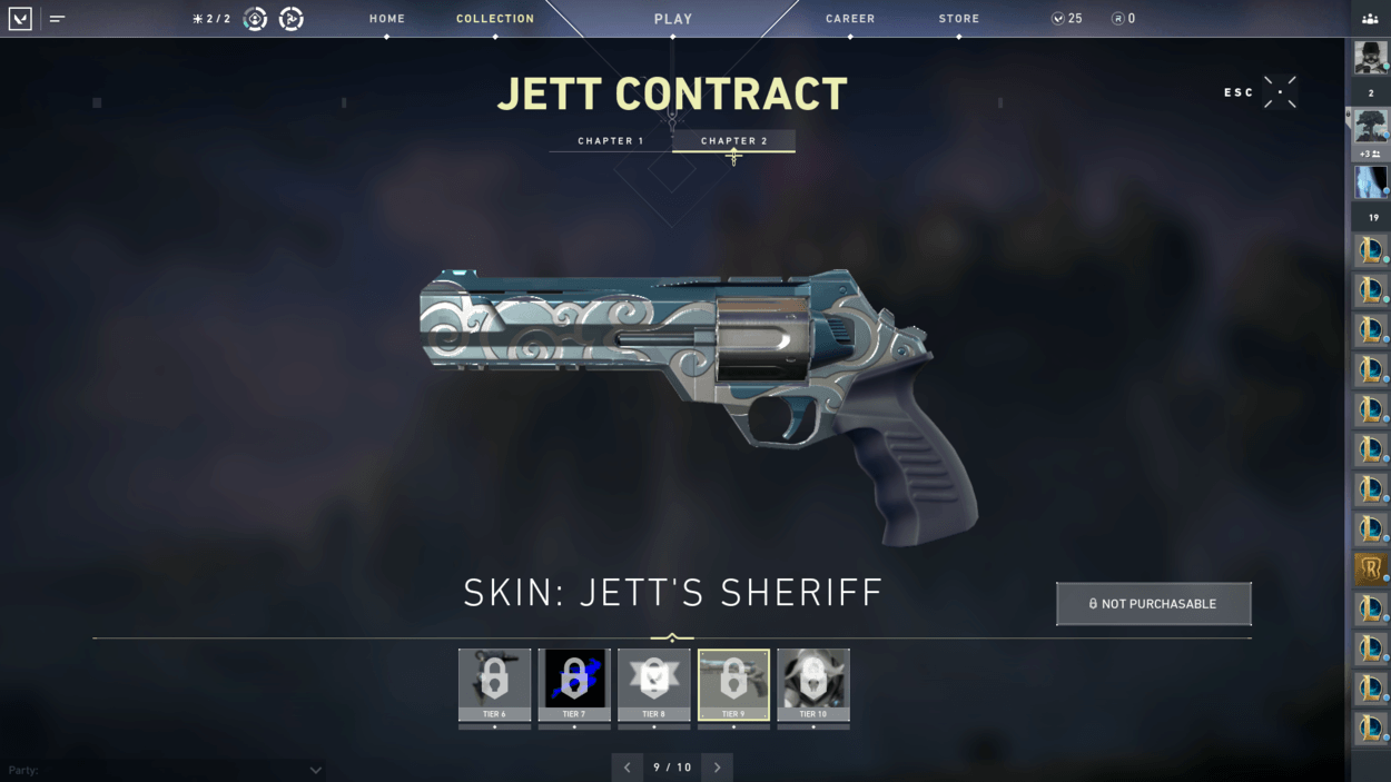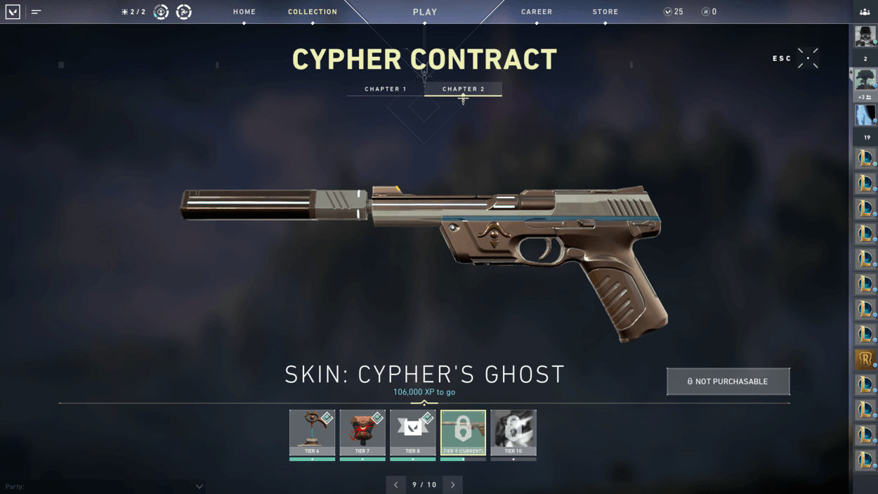So, you finished the starter series contract and unlocked two more characters? You also finished the closed beta rewards set? Well, have you noticed players on your team with pistol cosmetics or gun buddies that you haven’t seen in the store? That’s because there are additional contracts for each agent that reward you exclusive cosmetics! For free! There are ten tiers for each agent, including a gun buddy at tier 6 and an exclusive pistol skin at tier 9.