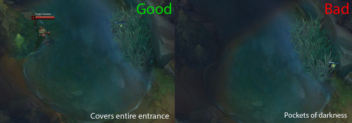 Perhaps you have experienced this before: you look at the map, you see no one and think to yourself, “Coast is clear, time to engage!”. Next thing you know, the enemy jungler comes out of nowhere and BAM! They score a double kill and take dragon, leaving you scratching your head wondering how they got there. Ensuring your ward covers the entire entrance in an area is crucial, you should always be thinking about the value the ward is giving you.