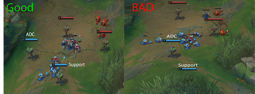 Mistakes can happen as early as the first wave of the game, that is why the first thing to look out for in your games is your positioning during the laning phase. Poor positioning in lane is one of the most common mistakes support players make. Oftentimes you will see support players standing far behind their ADC or hiding in the bush doing nothing, essentially leaving their ADC vulnerable to an engage by the opponents. By standing behind your ADC, you are exerting zero pressure and allowing the enemy to have full control and priority over the lane.