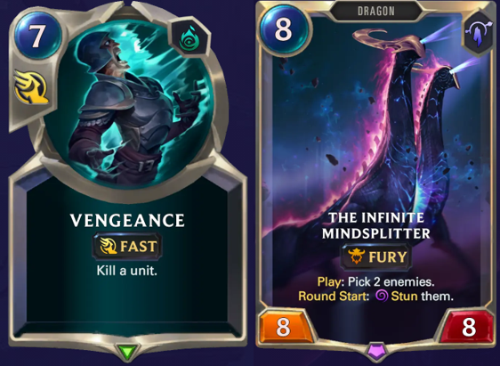 Let's imagine you just used all of his mana to play an Infinite Mindsplitter and your opponent uses Vengeance on it. The trade that happens is of one card for one card, but who gained Tempo from the play? The answer is simple, your opponent not only gained a 1 mana advantage from the mere costs of the cards, but he could have also played his Vengeance using spell mana, trading it for your full “unit” mana and being able to play units after the resolution of the pile.