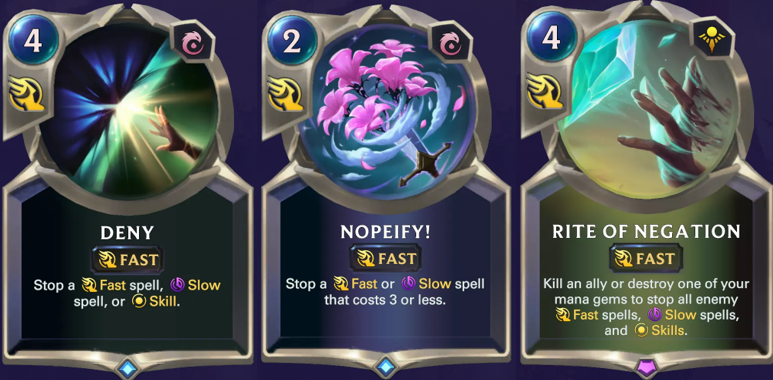 It's also important to keep in mind your opponent's list though. For example, if you are playing against a Spider Aggro deck and he tries to kill one of his own units with Glimpse Beyond, that might be a good Deny spot if his hand is already thin, while you will try to use a Nopeify instead or just let it through if you are against a Nasus Thresh deck due to the possibility of Atrocity being played.