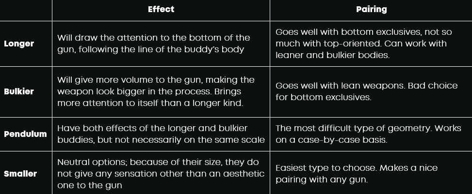Just remember that the pairing column of the table should be used as a guideline since it is not an immovable truth. By analyzing the buddy by its shape, you can avoid making weird combinations and blow the harmony of your skin. However, at the end of the day, it is not only the geometry that will make it look good on the weapon. Each buddy is unique and you always need to pay attention to its details when committing to use it.
