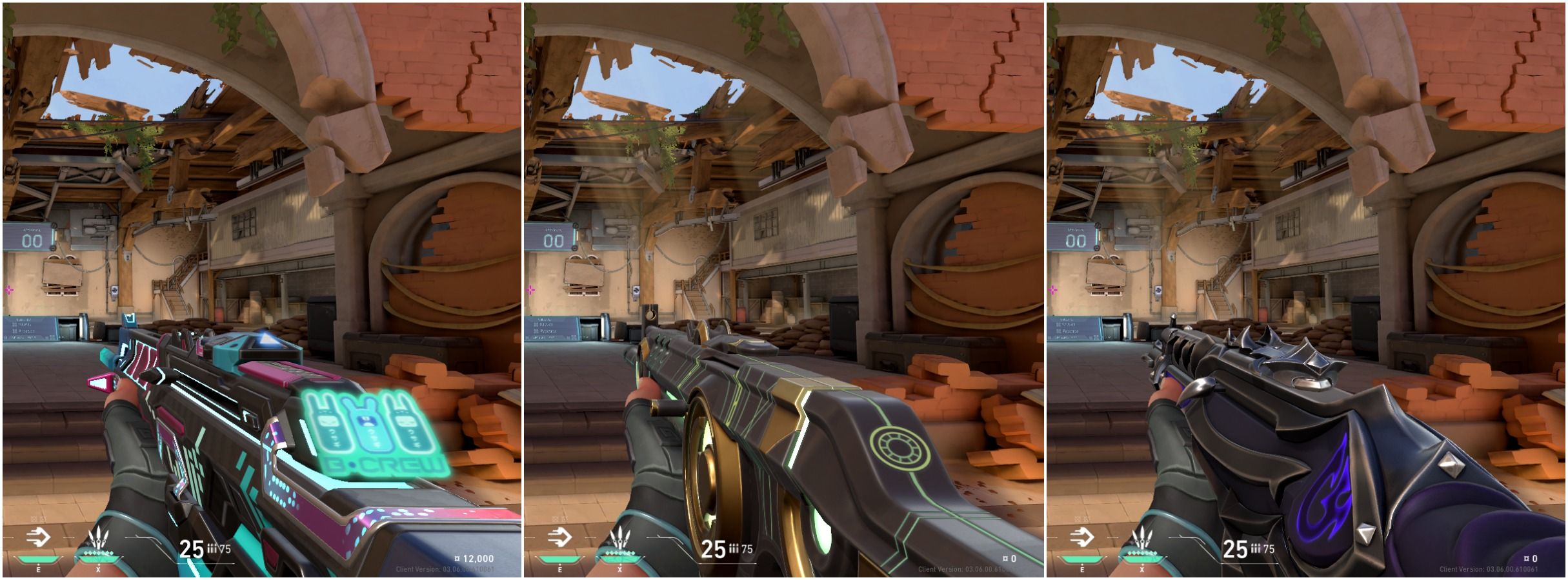 First, look at the general form of the weapon: is it bulkier? Maybe it is on the slimmer side? As a rule of thumb, leaner weapons are easier to combine with since they may look like a blank canvas; in a bulkier one, you’ll need to deal with the extra volume of the gun. What you need to observe here, however, is that, while the structure of said weapon doesn’t change from skin to skin, the location of the details that each skin brings to the gun gives the impression of differences in its proportions.