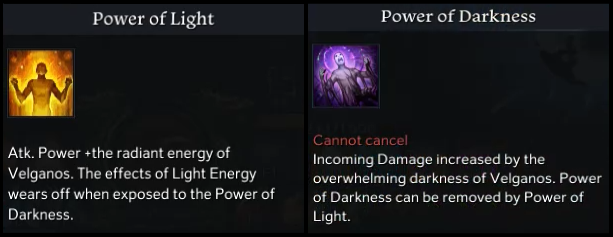 Power of Darkness is a debuff that increases damage taken by Velganos with each stack, stacking up to five times. A stack of this debuff is gained each time a player is hit by a dark attribute attack. Similar to Power of Light, this debuff does not have a duration and will only be reset when transitioning phases.