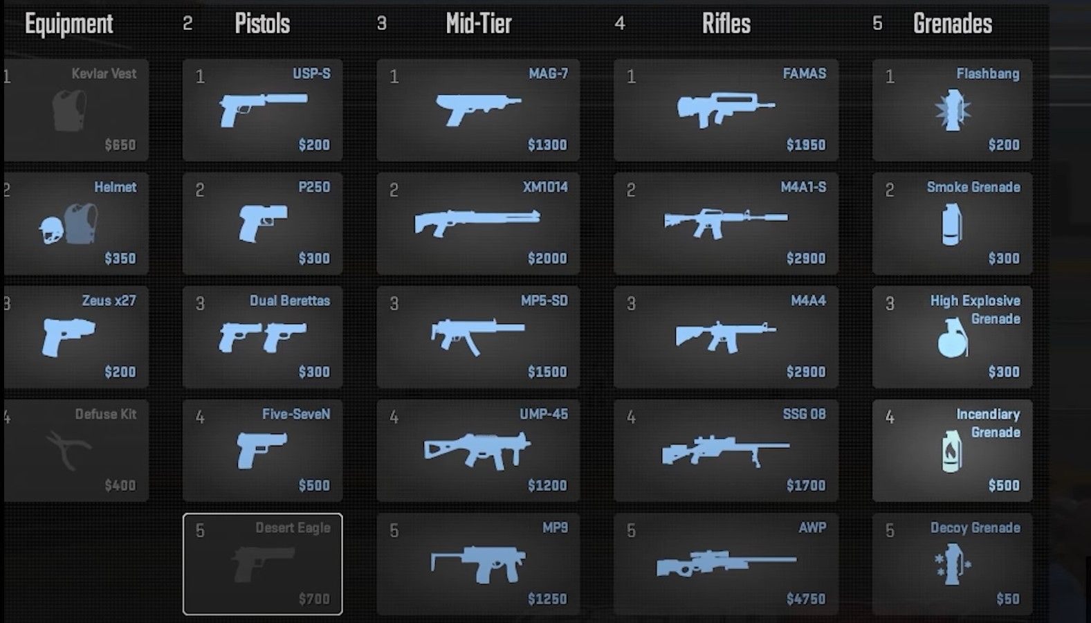 In the first round, you and your teammates spawn with a default pistol and $800 to purchase any additional items you need (in Casual, you receive $1000). Right away, you won’t be able to buy expensive items like sniper rifles, as they’ll be out of your budget. You’ll have to stick to cheaper pistols like the Deagle or CZ75-Auto.