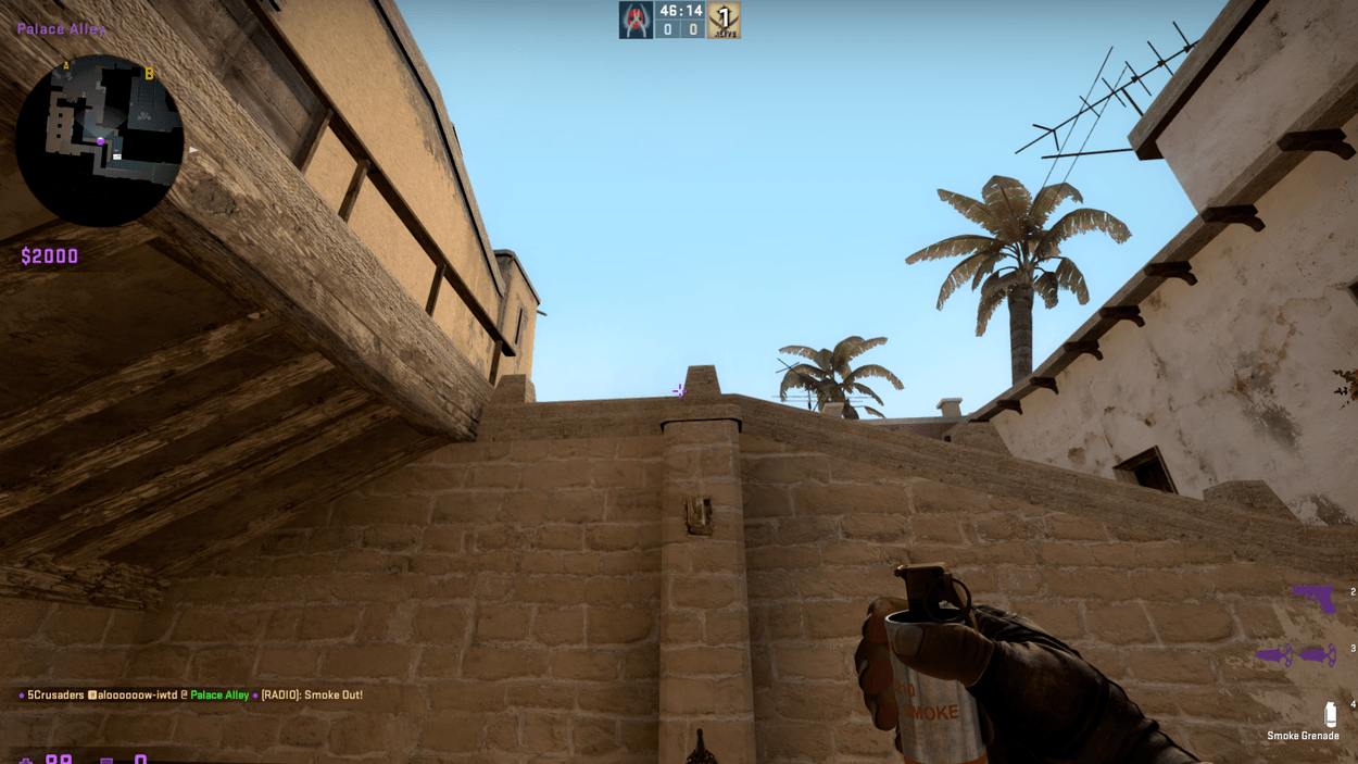 For this smoke, you must align yourself with a TV antenna between Palace and Spawn. You must then hold your crosshair on the most leftward antenna and then jump throw the smoke. If you have done this correctly, Snipers' Nest should be completely smoked off and you will be safe to push up Mid without being spotted from Window. However, you need to be careful of Cat and Connector and possibly get your teammates to smoke them off so you can easily take Mid control.
