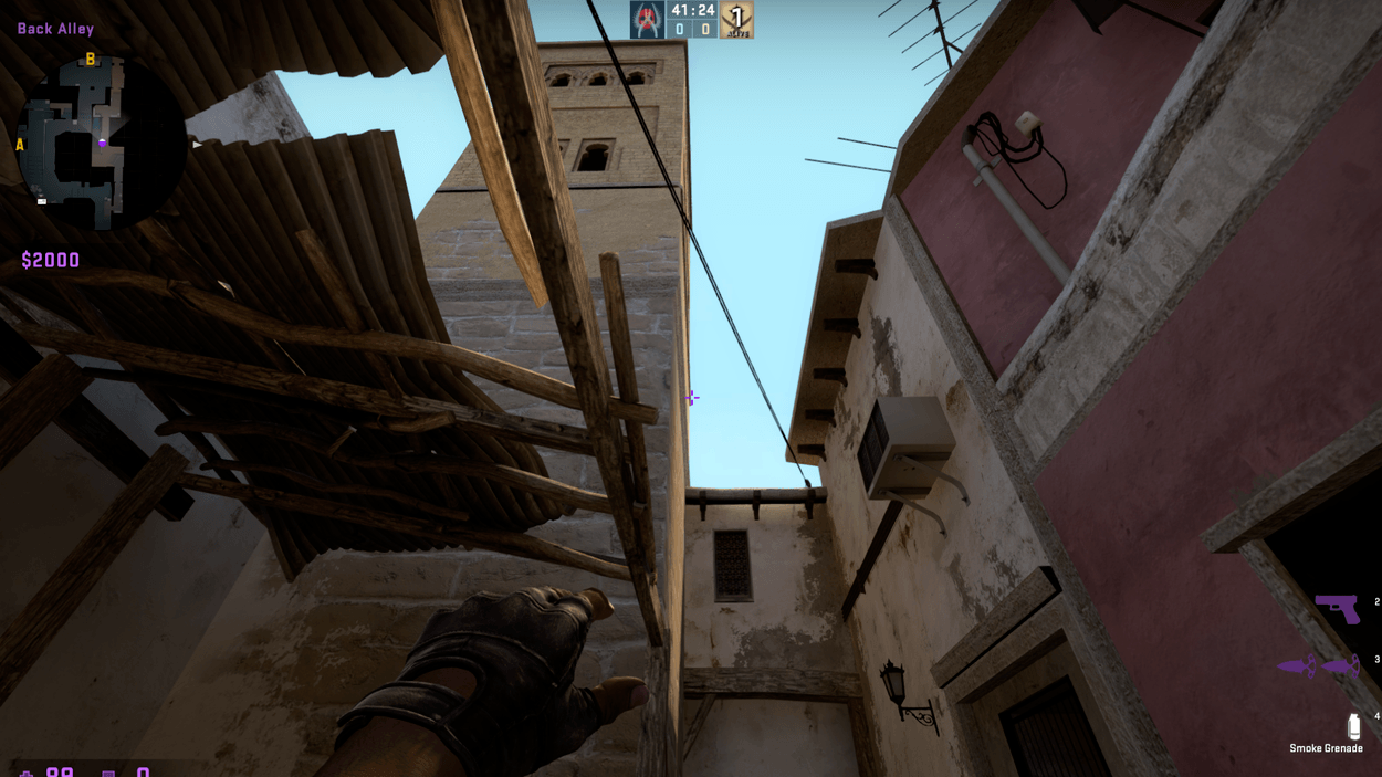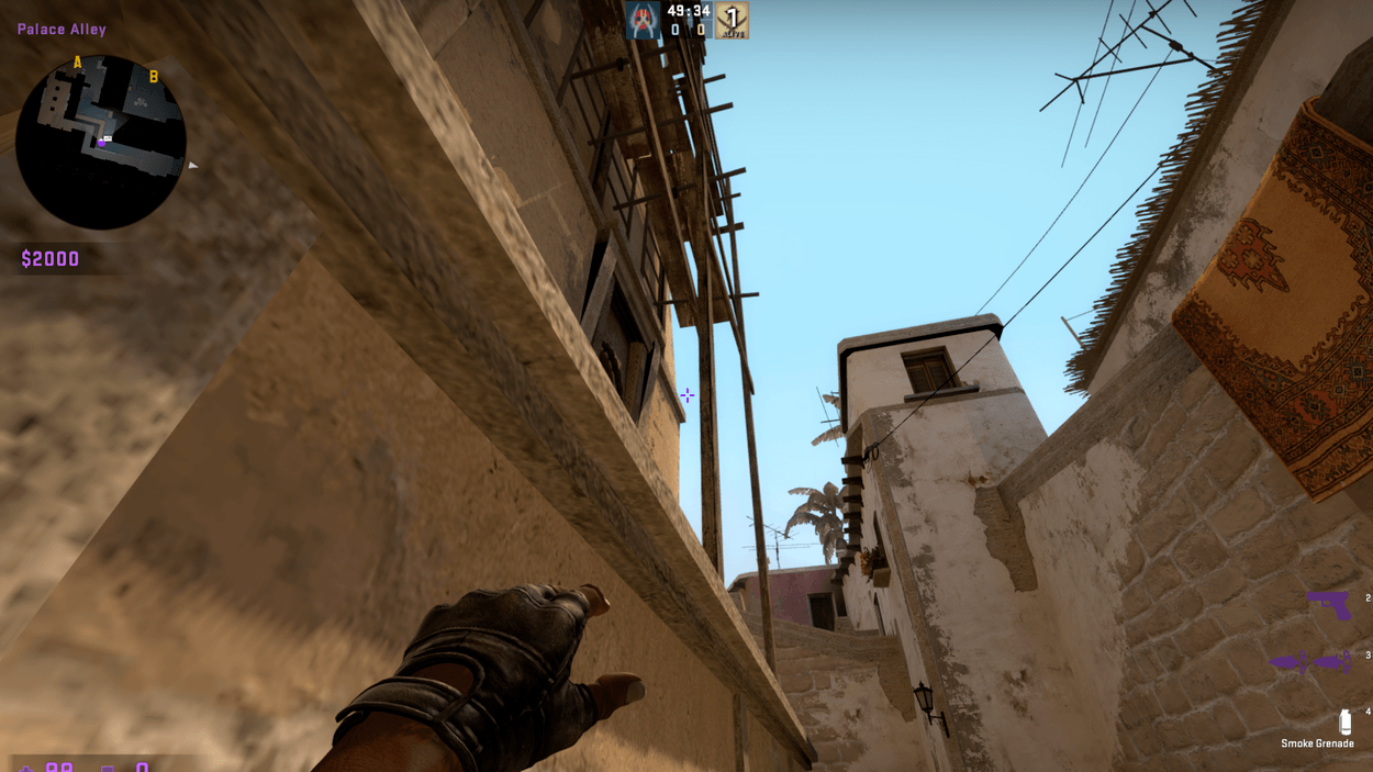 This is a very key smoke for taking A-site quickly and cleanly. With this smoke, your Palace player will be able to isolate a frag on whoever is Default or Triple before the guy on Stairs is able to react. To do this smoke, you need to line up with the gap in between the furthest left pole and the wall and then jump throw the smoke. For this to work, one of the players in Ramp needs to throw this smoke approximately ten seconds before the player in Palace peeks so you can be absolutely certain that there is no chance of a refrag from Stairs. You could try this with two players in Palace and have one watch Balcony, in case a CT tries to go up the ladder, and have the other player take out the guy in Default or Triple.