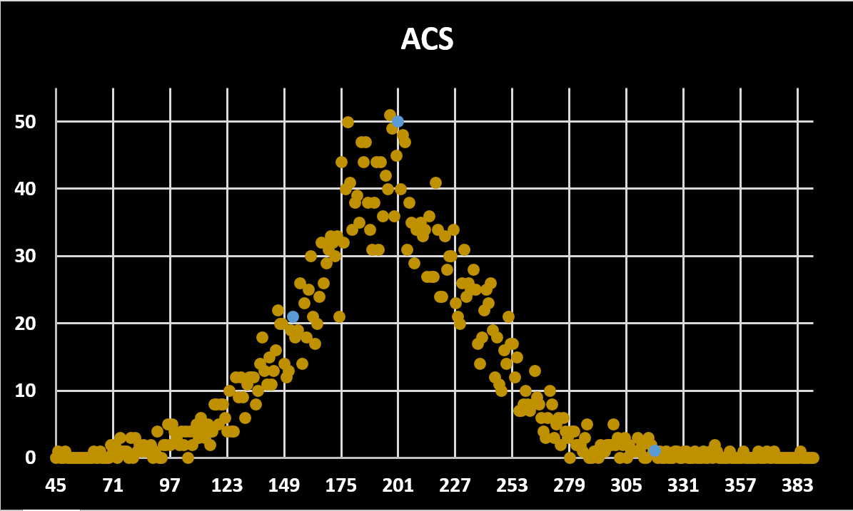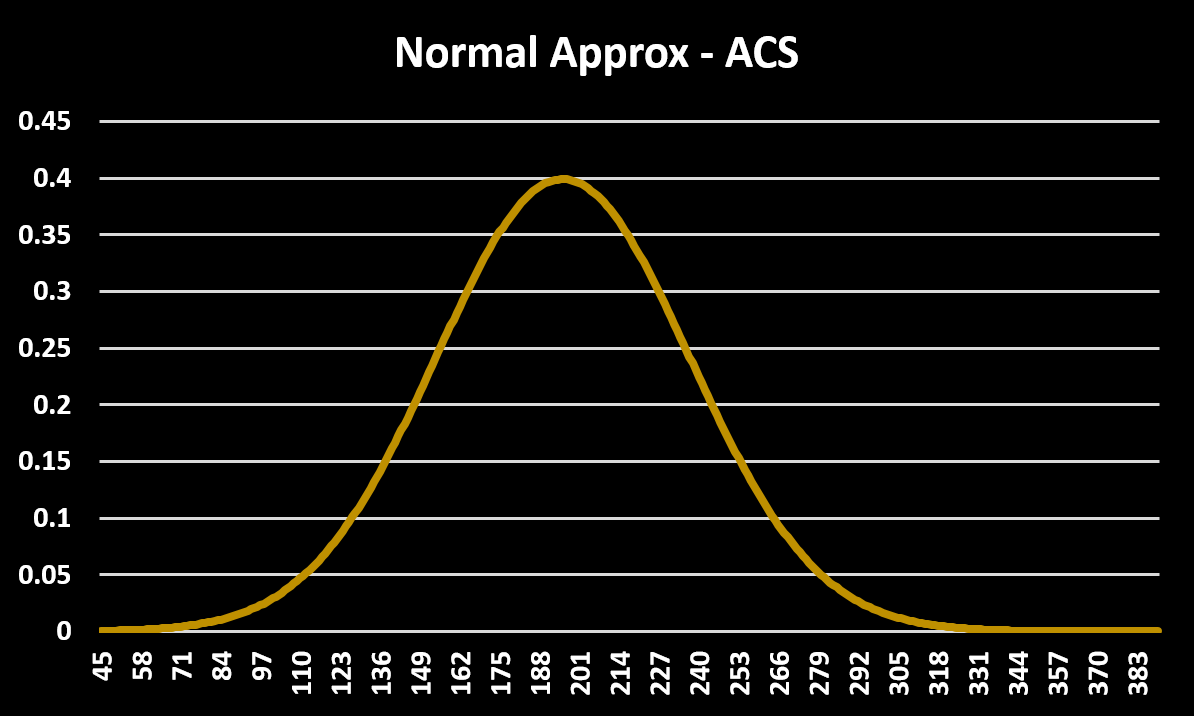 Instead of focusing on individual players, let’s look at the trend and pattern. Similar to a Bell Curve, right? Now, one trick that many statisticians use to sort of “cheat” the system is that if it LOOKS like a normal curve, it probably is a normal curve. To avoid any unnecessary theory, the general idea is that, as we gain more and more data, many other probability distributions actually approach the Normal Distribution. Put another way, the more stuff we have, the more it’ll look like a bell curve. Here is a Normal Approximation of our ACS Data: