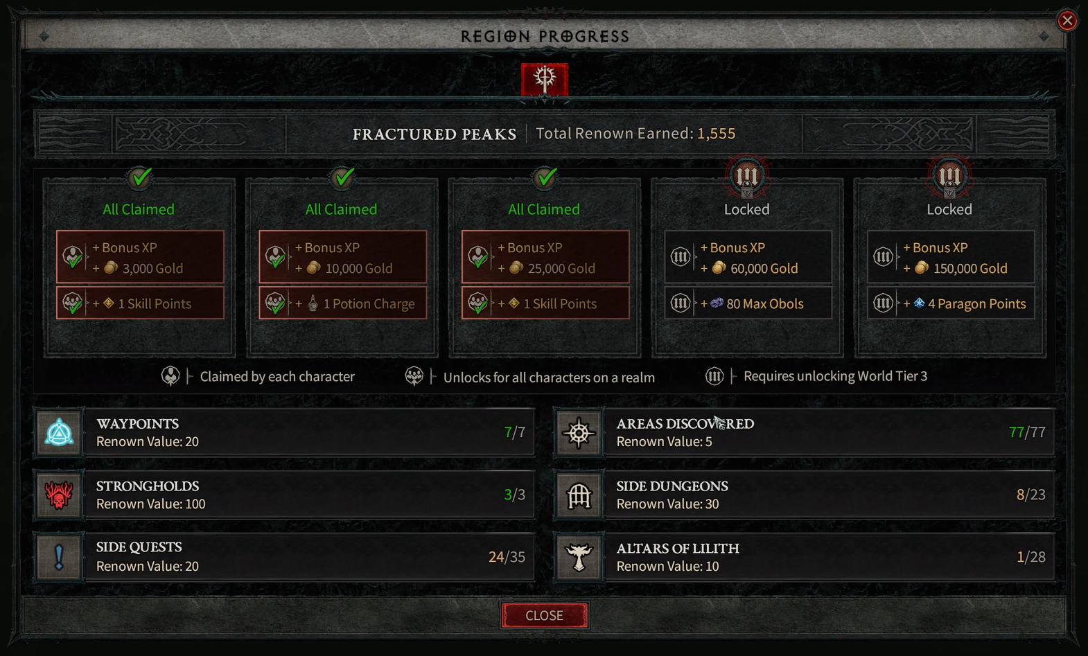 The Renown system is an interesting feature in Diablo IV that encourages exploration in the open world and grants players rewards such as gold, EXP, Skill Points, and Paragon Points. It’s reminiscent of Lost Ark’s Collectibles and Adventurer’s Tome, providing additional power to the characters. While I appreciate horizontal progression systems that encourage open world exploration and completion, I am concerned about how this will work with seasonal resets. Will players need to redo this process every season? This could potentially become tedious, requiring players to rediscover ‘Altars of Lilith’ or redo side quests across all regions, not just Fractured Peaks. Hopefully, this feature will be account-wide and retain most of its progress across different seasons