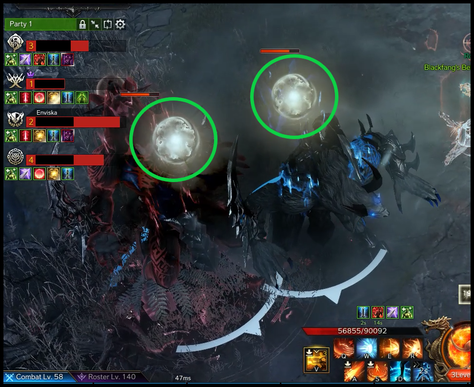 Whirlwind Grenades are highly recommended, and players should try to throw it after four orbs have been soaked for greater efficiency. If players are struggling to visually see when other players have soaked their respective orbs, it is recommended to use the Wolves’ debuff stacks as an indicator. Prior to the orbs being summoned, players can attack the boss to ensure the health bar is visible. This will allow players to see the number of debuff stacks under the health bar. Players can use the debuff stack count to indicate when it is their turn to soak the orb. For example, player six should soak the orb right as the stack count reaches five.