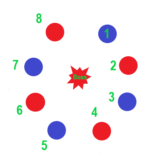 The first player should stand directly on top of the orb spawn so that they can soak it right as it appears. Players two to four should position themselves between the boss and the orb spawn so they can quickly soak their respective orbs in order. Players five to eight should position themselves next to their orbs on the outside of the encirclement. This gives players five to eight more space to kite the orbs as they await their turns. It also gives the first four players more room to maneuver so they don't accidentally soak an extra orb.