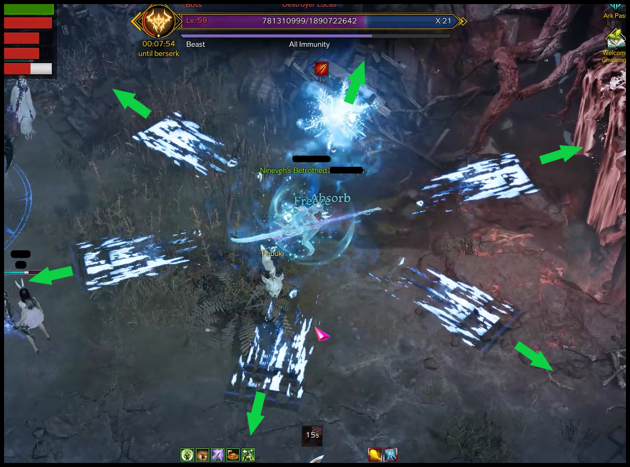 The boss goes into a crouched position with his arms folded and begins summoning multiple mines in random locations. The mines will explode after a short delay and knock up anyone hit.