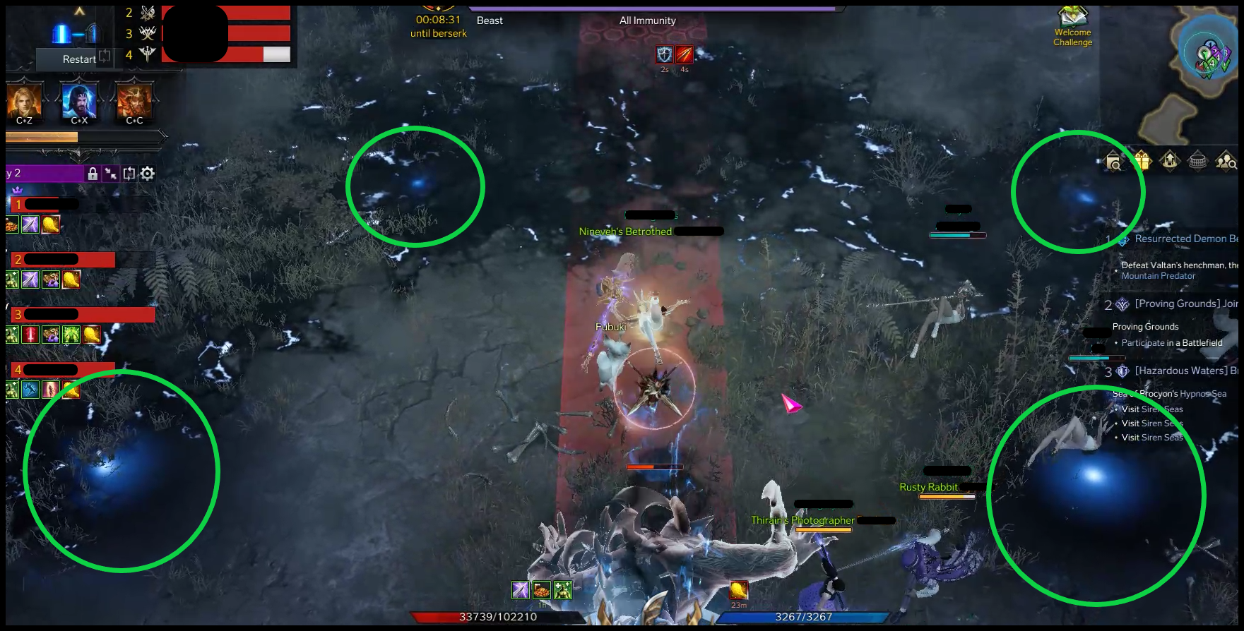 If the Wolves are too close to each other, they will gain a defensive buff, reducing the amount of damage they take. This buff is indicated by the orb above each wolf. When the orb glows yellow, it means the buff is activated, while a smokey, white orb indicates the buff is deactivated. Players targeted by each wolf should head to opposite ends of the area to ensure the defensive buff is not activated. The raid group should decide in advance where players should go. For example, the raid group can decide to have the invader always near the south and the non-invader near the north. The invader will flee after a short period of time.