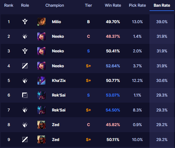 So, today we’re going to break down the top five Champions according to ban rate on u.gg. Now, we’ll be going off of unique presence, so if a Champion is featured multiple times in the top five, we’ll talk about all their roles collectively instead of dedicating them a singular spot so we can cover as many Champions as possible. Anyway, let’s dive right in with League’s most banned Champion as of Patch 13.12 - Milio.