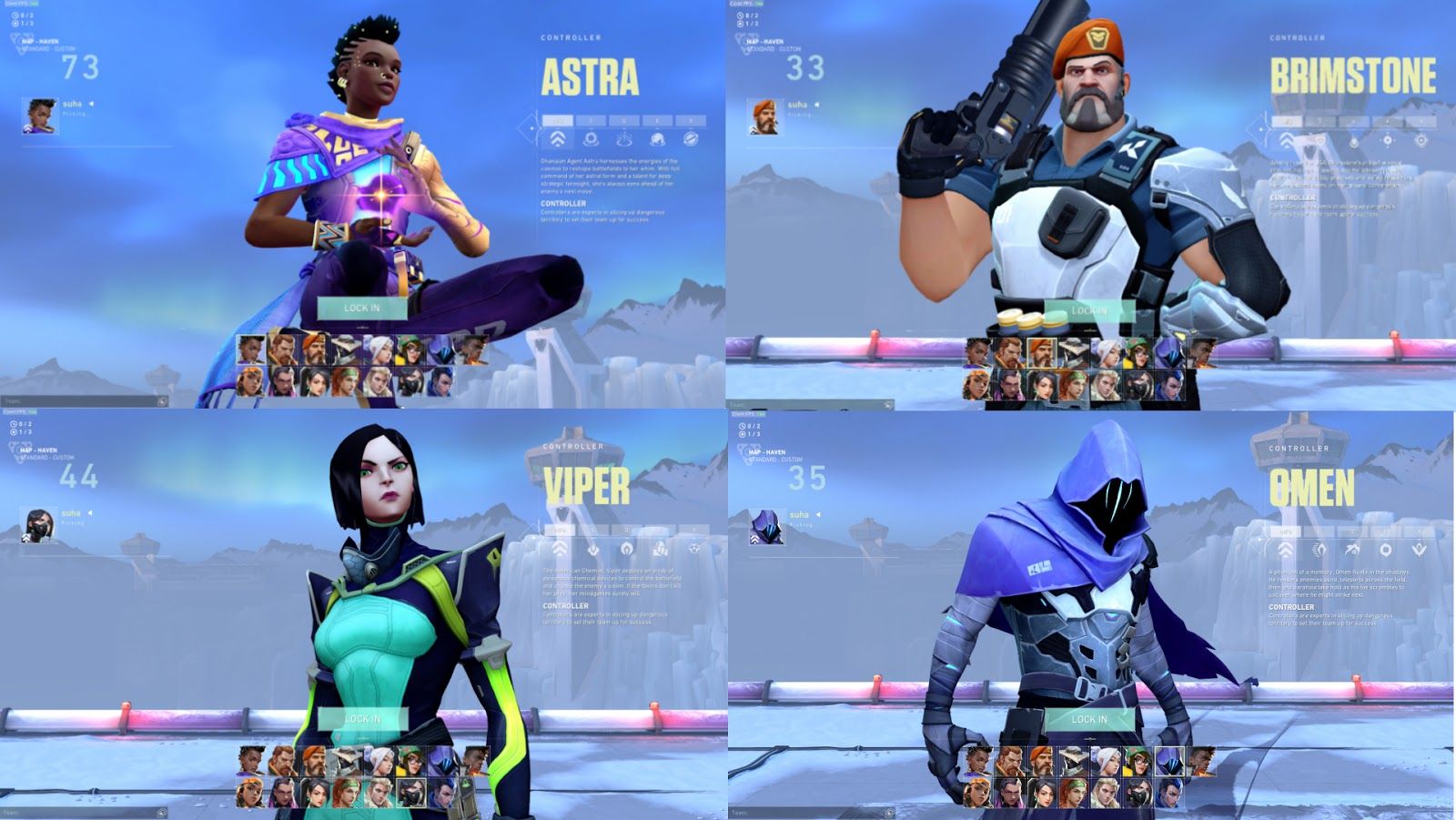 The next class we’ll go to is the Controller class. The controllers are “experts in slicing up dangerous territory to set their team up for success”. This in simple terms, means that controllers divide the map by using smokes or similar abilities to create visual cover. The four controller agents are Astra, Brimstone, Omen, and Viper. Smokes remove vision from enemies, and force them to either walk through to the other side into potential danger, reposition, or wait for the smoke to fade. By taking vision away from one side, it reduces the potential of an enemy being there. Controllers can take advantage of smokes to either speed up or slow down the game.