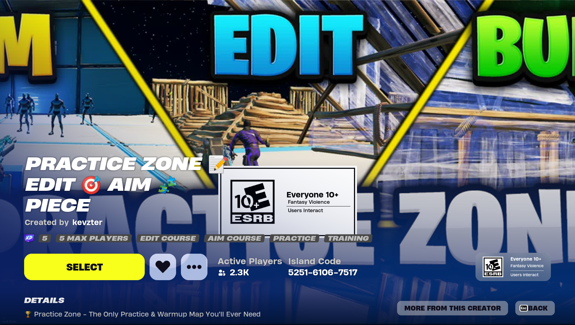 The next map on the list is Practice Zone Edit, Aim, Piece. This map has nearly everything you need to practice and brush up on your skills. There are five different zones to choose from, each with several drills that cover each area. The five zones are: the Edit Zone, Aim Zone, Build Zone, Piece Zone, and PVP Zone. All of these are incredibly detailed, with a seemingly endless amount of drills to choose from. With a maximum of five players, you can even practice these drills with your friends for group practice sessions.