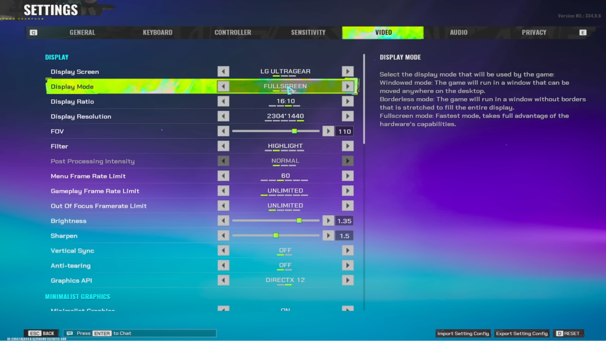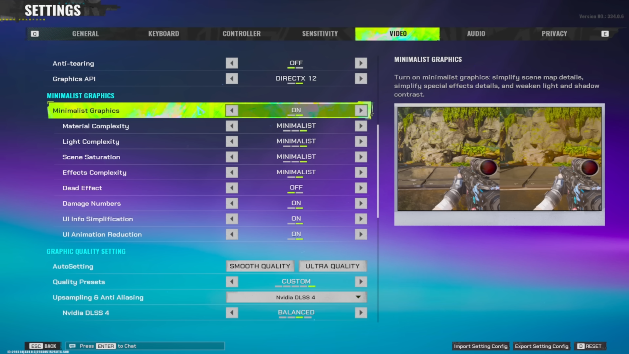 If you prefer clarity over flashy visuals, Minimalist Mode removes excess effects and UI clutter. It’s a good setting to experiment with. There is a slight FPS gain here as well, but nothing too crazy. Try it on your own and see if you like it. If you do consider turning it on you can use the following settings.