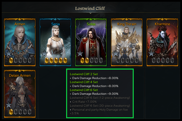 The Lostwind Cliff set is what most damage dealers will strive for first, due to its most important effect, +7.00% Crit Rate, locked behind only 12 Awakenings. This set is considerably ‘easier’ to get than Light of Salvation but will still require quite some time to obtain. The reason why this set is often targeted first is because the majority of the 12 Awakenings can be obtained without too much RNG. For support classes, the 30-piece Awakening effect is the ultimate end goal since it synergizes with damage dealers that have Light of Salvation.