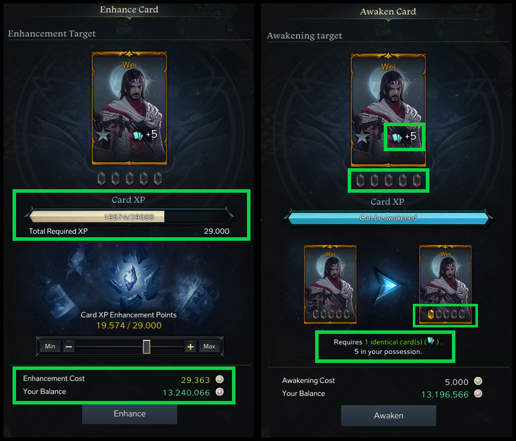 Accumulation of Card XP Enhancement Points can be quite slow relative to the amounts needed for enhancing Cards. It is recommended to only Awaken Cards necessary for players’ desired end-game sets due to the extremely high Enhancement Point and Silver costs. Even common early game Card Sets should not be Awakened as their base set effects will suffice.