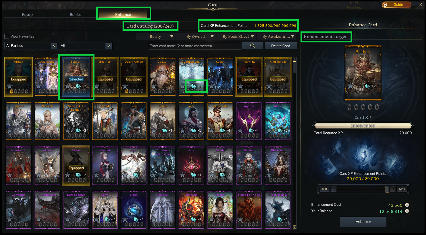 The Card Catalog can be accessed with the default keybind ‘Alt+C’ or through ‘Roster’ at the bottom right of the UI and clicking on Card Catalog. There are three main tabs in the Card Catalog: Equip, Books, and Enhance.