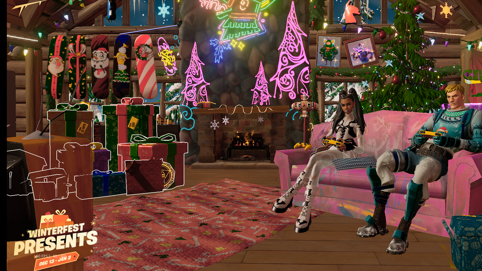 As if receiving 17 items was not enough, there are even more rewards and benefits that players can find while playing during Winterfest. If you are a member of the Fortnite Crew, you will receive a Chill-la-la-la Llama Back Bling which sneezes when you open chests or get an elimination. Also, if you play with five different friends in any of the game modes, you will receive the Curling Iron Emote as well. Finding the hidden pieces of pizza in the Cozy Lodge will give you an easy 10,000XP, as well as resting by the fireplace. By poking around the Cozy Lodge, you can discover different items you can interact with. The bells on the right side of the screen play a song for you, the yellow gamepad will allow you to drive a motorcycle around the room, and you can turn on/off the neon sign above the fireplace. Also be sure to check out the Items Shop, as there is a Gringle Guff skin that you can claim for free.