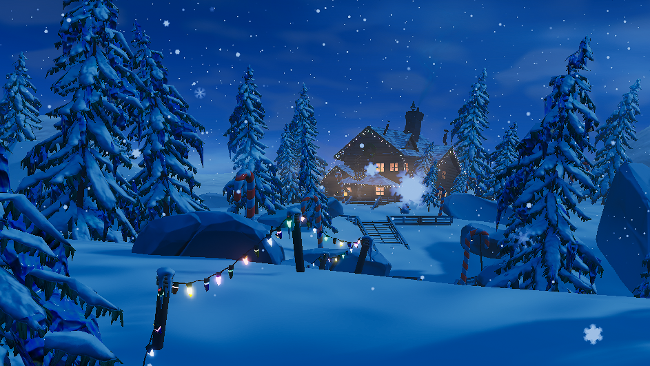 Besides the addition of the Cozy Lodge and Christmas decorations sprinkled around the map, there are a few key Winterfest changes to keep a watch for. First is weaponized snow! In game, you may find a Snowball Launcher that shoots large exploding snowballs, similar to a Rocket Launcher. This explosive gun is great for taking down builds and laying waste to the enemies in a fun snowball fight way. Also, there are great mounds of snow that when pickaxed, form a large snowball. A player can hop inside the snowball and roll (or fall) safely down from a height, leveling the competition in the way and destroying builds.