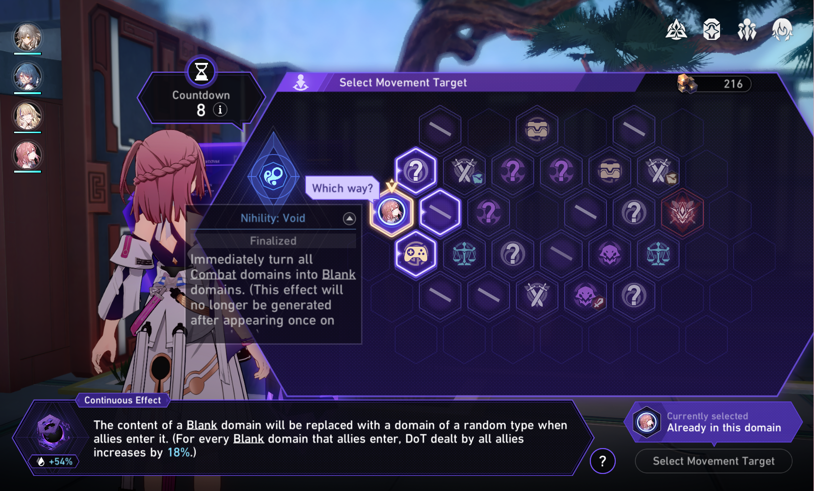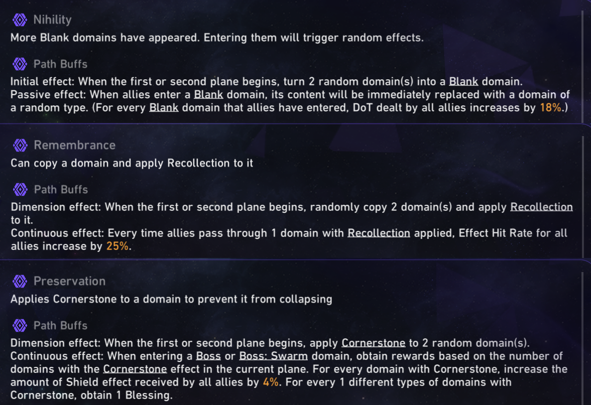 Each Path has a Dimension and Continuous Effect, which provide unique ways to enhance their strength. Dimension Effects occur right when you enter the first and second Planes. Continuous Effect is a permanent passive buff that you can strengthen based on each Path’s specific requirements. For example, Nihility’s Dimension Effect transforms two random Domains into Blank Domains, while its Continuous Effect strengthens DoTs for each Blank Domain you enter. In combination with Audience Dice, Continuous Effects are one of the best ways to strengthen your team.