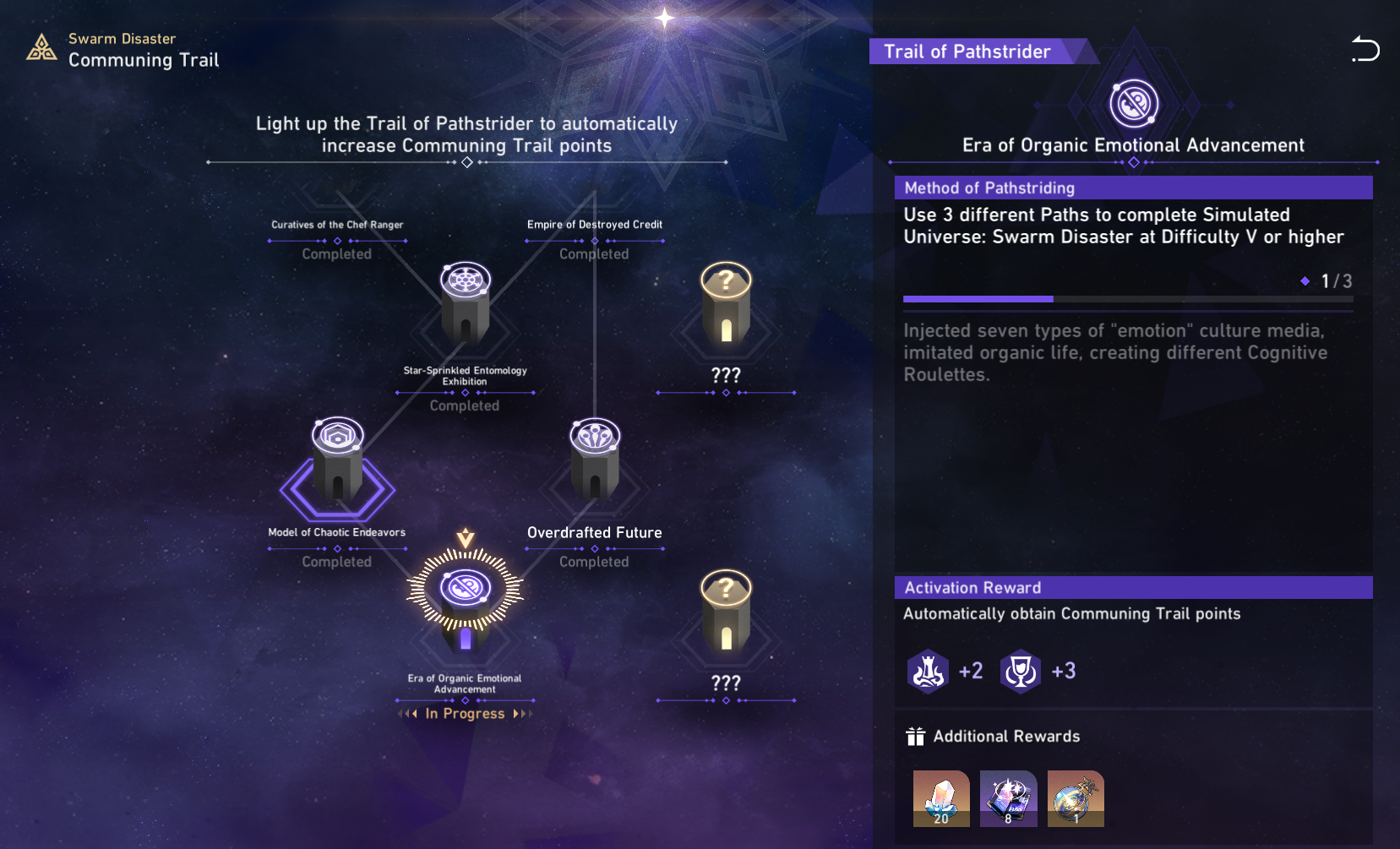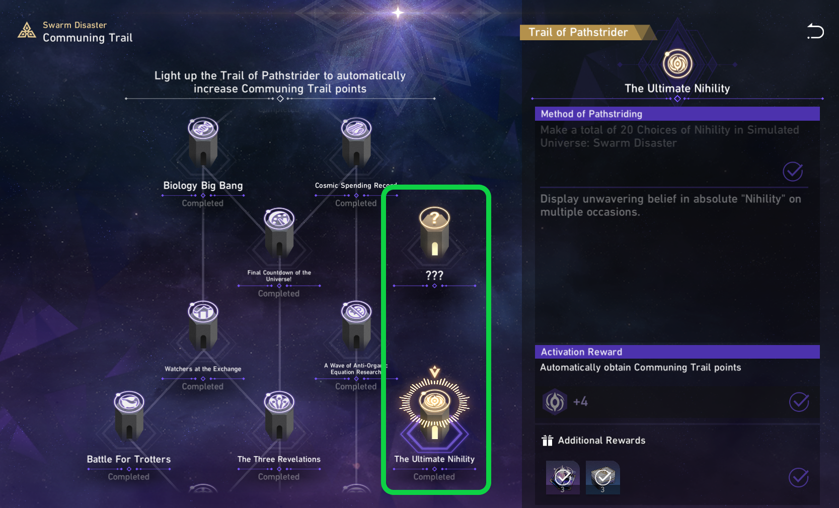 Besides the regular objectives, there are also hidden objectives located on the right side of the Trail. These objectives require you to make a total of 20 Path-specific choices during Swarm Disaster. There are seven hidden objectives corresponding to each of the Paths, except for Propagation. You can expect a Path choice to appear after defeating a Boss Domain, and there’s also a chance they may appear during Occurrence event choices.
