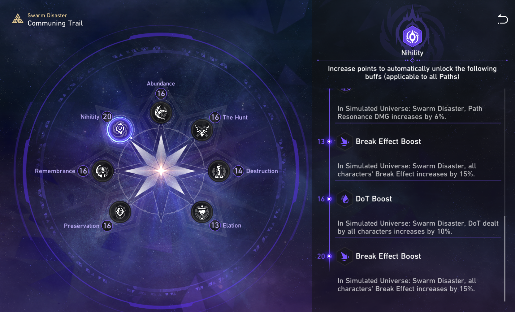 To access Swarm Disaster, you need to have Simulated Universe World 5 cleared and complete a series of tutorial quests with Herta. Just like a regular SU run, you will select one of the Paths available. Initially, most of the paths will be locked behind the tutorial quests and various objectives in Swarm Disaster. You can click on the locked Paths to see the unlock requirements.