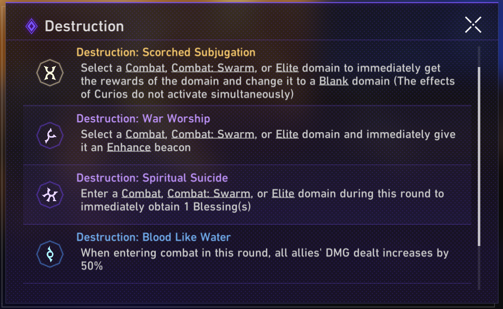 Beacons are additional effects that can randomly spawn on top of Domains, which provide extra rewards upon completion. There are four types of Beacons: Enhance, Mutation, Blessing Trotter, and Curio Trotter. Beacons can be identified by an icon on the lower right-hand corner of a Domain. Certain Paths, such as the Hunt, can also generate Beacons on top of existing Domains.