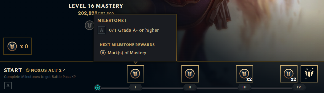 Marks of Mastery are special milestones that make leveling up a bit more complicated, thanks to their specific performance requirements. The number of marks needed per level will depend on your current Mastery Level and how many you’ve already earned this split. You can easily check the requirements for earning Marks on your champion’s page in the “Collection” tab, under “Mastery.” There, you’ll also see a timeline with requirements for each level, and when the quests will reset!