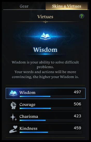 Wisdom, Courage, Charisma, and Kindness are the four Virtue Stats in Lost Ark. Players can find this information on the second tab in their Character Profile (P). Virtues are primarily used for Rapport Quest and Dialogue requirements and occasionally Collectibles, like Mokoko Seeds. In addition, some NPCs have Virtue requirements for Gifting them their favorite items (450 Points) as well. The various ways to earn Virtues Stats are: