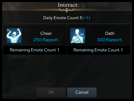 Working on Rapport can be quite a marathon considering there are over 70 NPCs in the game that players can build their trust with. The main way that players can increase Rapport is through daily ‘Song’ and ‘Emote’ performances. Each NPC will have one to two specific Songs and Emotes available for players to perform for them. Players have a total of five Songs and five Emotes that they can use per day, with an additional one for each if they have Crystalline Aura. These performances give Rapport points ranging from 250 to 400 depending on the NPC. Although they may not seem like much, these daily performances can add up quite a bit over time. Players can keep track of their daily performance count on the top left of their Rapport page (Alt + N).
