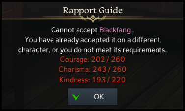As briefly mentioned before, upon reaching a new Rapport rank, NPCs may provide Rapport Quests or Dialogues that players can complete for additional points. Certain quests and dialogues must be completed before players can proceed to the next Rapport level for that NPC. This will be the main hurdle for certain NPCs as many of these quests and dialogues have high Virtue Stat requirements to unlock them.