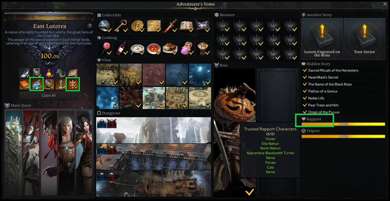 Rapport in Lost Ark is essentially the players’ level of relationship with various unique NPCs in the game. As players’ Rapport increases with each NPC, they will be rewarded with perks such as Gold, Cards, Skill Runes, Stat and Vitality Increase Potions, and Collectibles. The Rapport page can be accessed through the ‘Adventure’ section or with the default key bind Alt+N. All the NPCs have four Ranks of Rapport, starting with Normal (Neutral), then Amicable, Friendly, and finally Trusted.